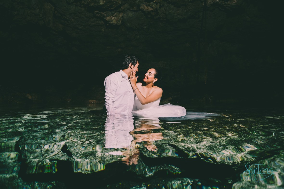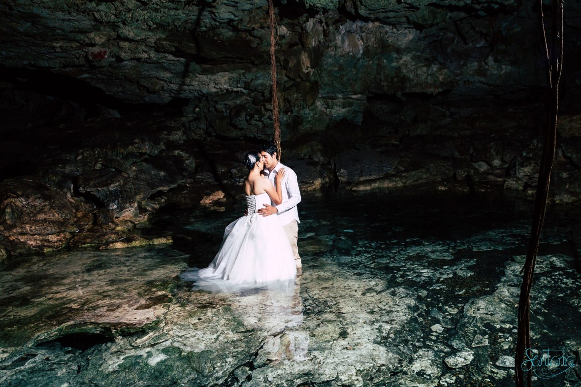 Para sellar su luna de miel con broche de Oro, se animaron a realizar su Trash the dress teniendo como escenario una cenote-caverna (impresionantemente bello) y por supuesto una playa despampanante.